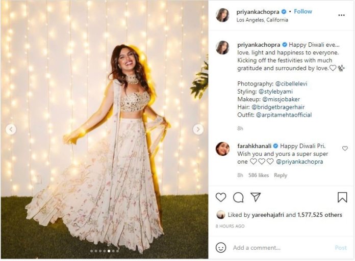 বর্তমানে যুক্তরাষ্ট্রের লস অ্যাঞ্জেলেসে অবস্থান করছেন হলিউড-বলিউড অভিনেত্রী প্রিয়াঙ্কা চোপড়া। হিন্দু ধর্মের অন্যতম বড় উৎসব দীপাবলিতে লেহেঙ্গায় সাজলেন তিনি। এবারের দীপাবলিতে এই অভিনেত্রী পরেছেন অর্পিতা মেহতার ডিজাইনে ফ্লোরাল স্কার্ট লেহেঙ্গা।