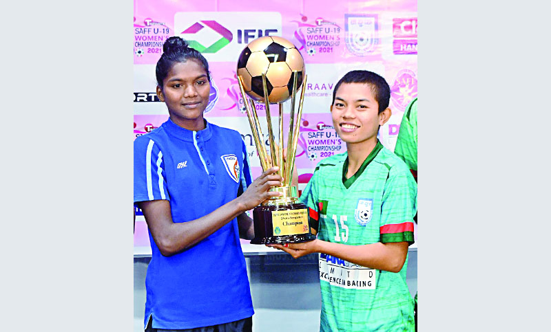 মেয়েদের অনূর্ধ্ব-১৯ সাফের ট্রফি হাতে ভারত ও বাংলাদেশের অধিনায়ক