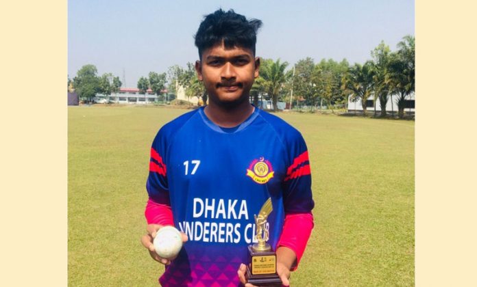 হ্যাটট্রিকসহ ৯ উইকেট নিয়ে তাক লাগিয়ে দিয়েছেন তন্ময় আহমেদ। ঢাকা ওয়ান্ডারার্স ক্লাবের এই বাঁহাতি স্পিনার ৭ দশমিক ৩ ওভারে ৩ মেডেনসহ ১৮ রানের বিনিময়ে ৯ টি উইকেট শিকার করেছেন।