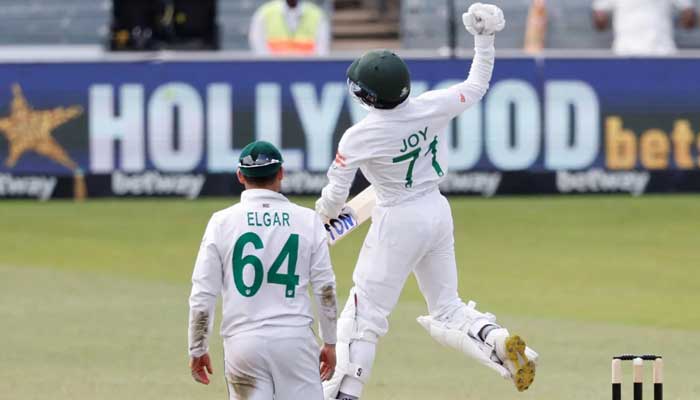 এর আগে তরুণ পেসার খালেদ আহমেদের চার উইকেট নেয়ার সুবাদে প্রোটিয়াদের প্রথম ইনিংস থেমে যায় ৩৬৭ রানে। এরপর ব্যাট করতে নেমে দলীয় ২৫ রানেই ওপেনার সাদমান ইসলাম সাজঘরে ফিরে গেলেও বাংলাদেশ ভালোভাবেই এগিয়ে যাচ্ছিল। কিন্তু বিপত্তিটা বাধে তৃতীয় সেশনে এসে। দক্ষিণ আফ্রিকার ডানহাতি স্পিনার সাইমন হারমারের ঘূর্ণিতে ১৪ রানের ব্যবধানে ৩ উইকেট হারিয়ে ফেলে বাংলাদেশ। দলের সবচেয়ে অভিজ্ঞ দুই ব্যাটার অধিনায়ক মুমিনুল শূন্য ও মুশফিকুর রহিম ৭ রানে ফিরে গেলেও তরুণ ব্যাটার জয় পরাস্ত হয়নি প্রোটিয়াদের স্পিনে। একের পর এক যাওয়ার আসার মিছিলে জয়ই ছিলেন বাংলাদেশের একমাত্র নির্ভরতার প্রতীক। দ্বিতীয় দিনের একদম শেষ ভাগে তাসকিনকে নিয়ে মোকাবিলা করেছেন হারমার-মহারাজকে। ১৪১ বলে ৪৪ রানে অপরাজিত থেকেই দ্বিতীয় দিন শেষ করে আসেন মাহমুদুল হাসান জয়। দ্বিতীয় দিনে লিটনকে নিয়ে ষষ্ঠ উইকেটে গড়েছেন ৮২ রানের জুটি।