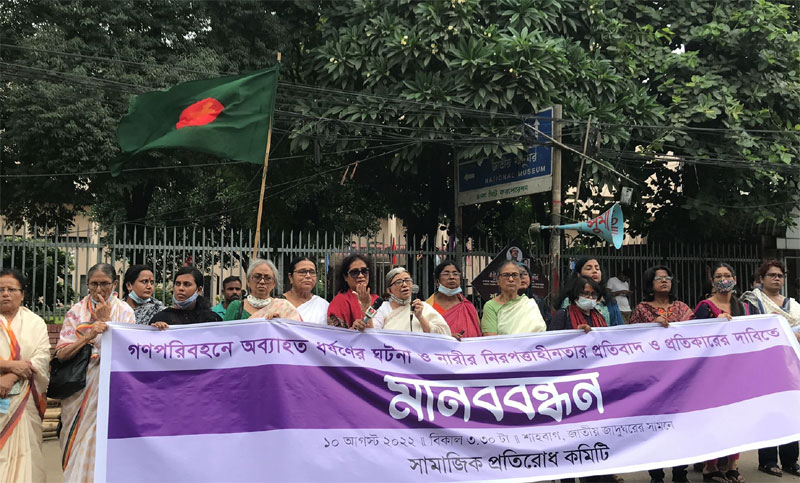 গণপরিবহনে অব্যাহতভাবে ধর্ষণের ঘটনা ও নারীর নিরাপত্তাহীনতার প্রতিবাদ ও প্রতিকারের দাবিতে মানববন্ধন করেছে সামাজিক প্রতিরোধ কমিটি (৬৬টি নারী, মানবাধিকার ও উন্নয়ন সংগঠনের প্ল্যাটফরম)।