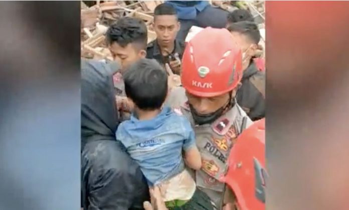 ইন্দোনেশিয়ার জাভায় শক্তিশালী ভূমিকম্প আঘাত হানার দুই দিন পর ধ্বংসস্তূপের নিচ থেকে এক শিশুকে জীবিত উদ্ধার করা হয়েছে। উদ্ধারকারীরা সিয়ানজুরে ধসে পড়া বাড়ির ধ্বংসস্তূপ থেকে ছয় বছর বয়সী ওই শিশুটিকে উদ্ধার করে।