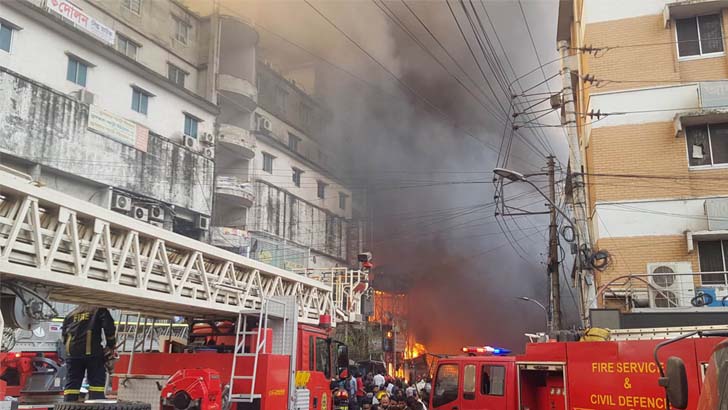 বঙ্গবাজারে আগুন নিয়ন্ত্রণে এখনো কাজ করছে ফায়ার সার্ভিসের ৫০টি ইউনিট। ফায়ার সার্ভিসের সদস্যরা মার্কেটের চার দিক থেকে আগুন নিয়ন্ত্রণে কাজ করছে।