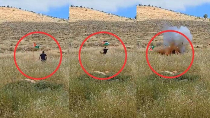 এ ঘটনার একটি ভিডিওতে দেখা গেছে, পশ্চিম তীরে একটি রাস্তার ধারে খোলা স্থানে উড়ছে ফিলিস্তিনের একটি পতাকা। ওই রাস্তা দিয়ে যাওয়ার সময় গাড়ি থামিয়ে নামেন এক ইসরাইলি। পরে তিনি পতাকাটির দিকে হেঁটে গিয়ে সেটিতে লাথি দেন। সঙ্গে সঙ্গে পতাকার সঙ্গে যুক্ত বোমার বিস্ফোরণ ঘটে। এতে আহত হন ওই ব্যক্তি।