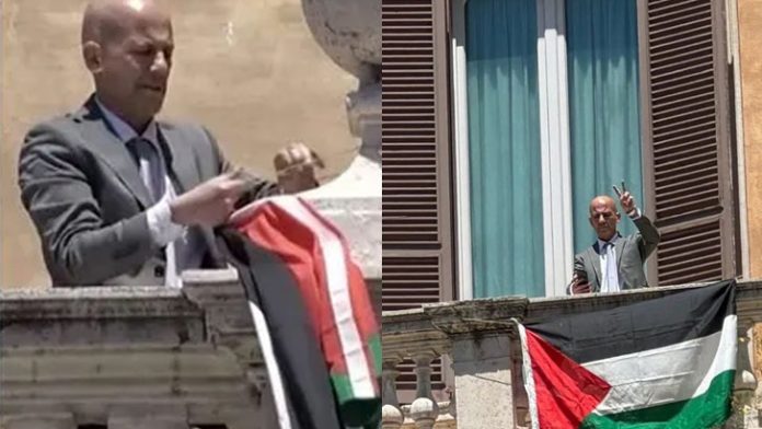 ইতালির পার্লামেন্টে ফিলিস্তিনের পতাকা উড়ালেন দেশটির সাবেক এমপি স্টেফানো আপুজ্জো।