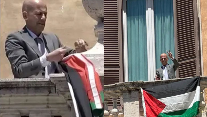 মোবাইল ক্যামেরায় ধারণকৃত দৃশ্যে দেখা যায়, রোমে পার্লামেন্ট ভবনের নিম্নকক্ষের জানালা টপকে কার্নিশে নেমে যান সাবেক এমপি স্টেফানো আপুজ্জো। হেঁটে হেঁটে চলে যান ব্যালকনিতে। সেখান থেকে নিজেই ঝুলিয়ে দেন ফিলিস্তিনের পতাকা।