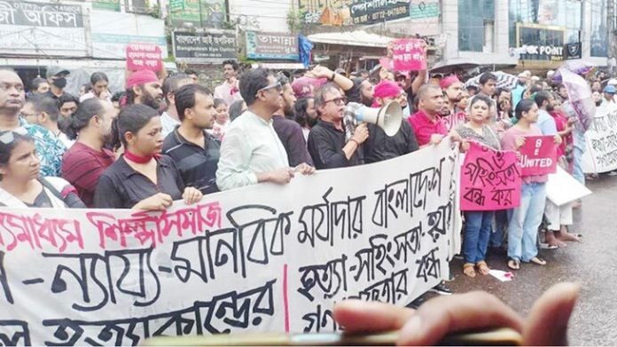 বৃহস্পতিবার (১ আগস্ট) শিক্ষার্থীদের সঙ্গে সংহতি জানাতে ফার্মগেটে সমবেত হয় শিল্পী সমাজ। বৃষ্টিকে উপেক্ষা করেই শিক্ষার্থীদের পাশে দাঁড়াতে এক হয়েছিলেন দেশের শিল্পীরা।