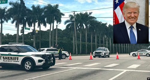 ফ্লোরিডার ওয়েস্ট পাম বিচে ট্রাম্প ইন্টারন্যাশনাল গলফ ক্লাবের বাইরে রোববার গুলিবর্ষণের খবরের পর কাউন্টি শেরিফের গাড়ি দেখা যাচ্ছে। ইনসেটে ট্রাম্পকে দেখা যাচ্ছে