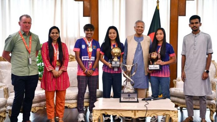 নারী সাফ চ্যাম্পিয়নদের রাষ্ট্রীয় অতিথি ভবন যমুনায় সংবর্ধনা দিয়েছেন প্রধান উপদেষ্টা ড. মুহাম্মদ ইউনূস। শনিবার (২ নভেম্বর) সংবর্ধনা অনুষ্ঠানে নারী ফুটবলারদের অভাব-অভিযোগের কথাও শুনেছেন তিনি। এসময় ফুটবলারদের সব ধরনের সমস্যা নিরসনের আশ্বাস দিয়েছেন প্রধান উপদেষ্টা।