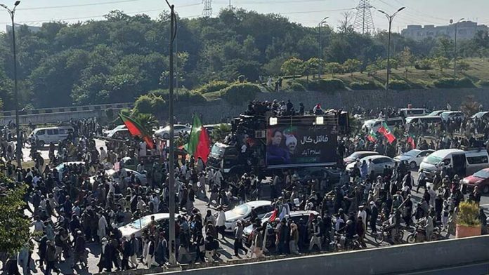 পাকিস্তানের সাবেক প্রধানমন্ত্রী ইমরান খানের দল তেহরিক-ই-ইনসাফের (পিটিআই) ডাকা সমাবেশ ঘিরে রাজধানী ইসলামাবাদ উত্তাল হয়ে উঠেছে। পথে পথে আইনশৃঙ্খলা রক্ষাকারী বাহিনীর বাধা ডিঙিয়ে মঙ্গলবার রাজধানী ইসলামাবাদের ‘ডি–চকে’ সমাবেশস্থলে পৌঁছে যান দলটির নেতা-কর্মীরা।