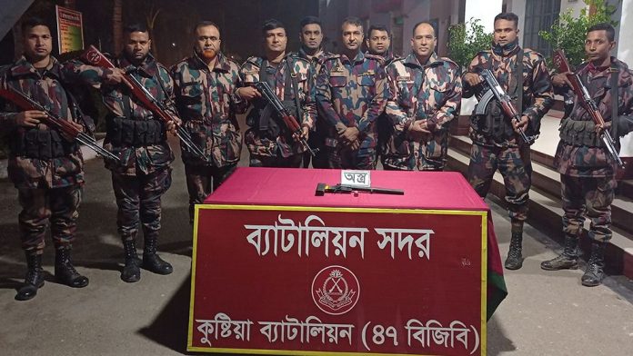 ভেড়ামারা (কুষ্টিয়া) : কুষ্টিয়ার মিরপুরে পরিত্যক্ত টংঘর থেকে অস্ত্র ও গুলি উদ্ধার করেছেন বর্ডার গার্ড বাংলাদেশ (বিজিবি) সদস্যরা। শুক্রবার কুষ্টিয়া ৪৭ ব্যাটালিয়নের অধিনায়ক লেফটেন্যান্ট কর্নেল মো. মাহবুব মুর্শেদ রহমান এ তথ্য নিশ্চিত করেছেন। এর আগে উপজেলার আমলা ইউনিয়নের নওদাপাড়া সেতু আনুমানিক ৩০ গজ উত্তরে পরিত্যক্ত একটি টংঘর থেকে ১টি সিঙ্গেল সুটার পিস্তল ও ১ রাউন্ড (লট নং কেএফ-১২) গুলি উদ্ধার করা হয়।
