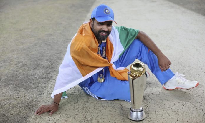 চ্যাম্পিয়নস ট্রফি সঙ্গে নিয়ে রোহিত শর্মা। ছবি : ক্রিকইনফো