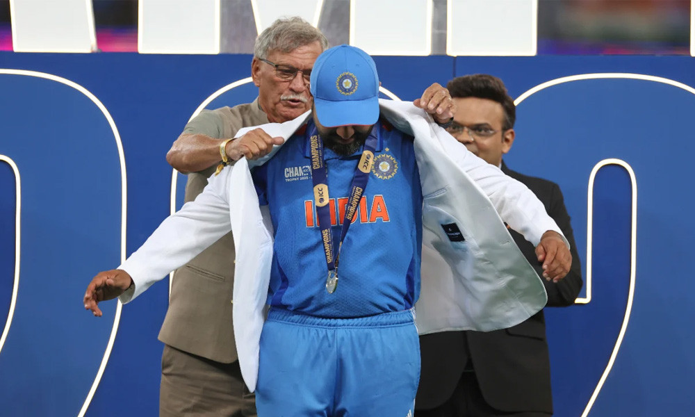 আইসিসির চেয়ারম্যান জয় শাহর উপস্থিতিতে রোহিত শর্মাকে চ্যাম্পিয়নস ট্রফির জ্যাকেট পরিয়ে দিচ্ছেন বিসিসিআইয়ের সভাপতি রজার বিনি। ছবি : ক্রিকইনফো