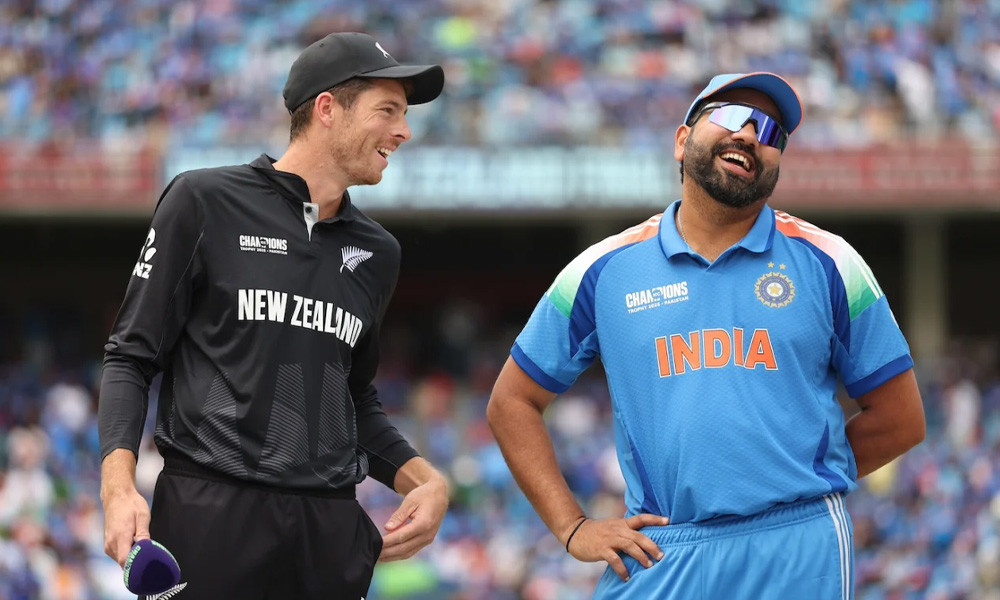 চ্যাম্পিয়নস ট্রফির ফাইনালের টসের আগে হাসিমুখে স্যান্টনার ও রোহিত। ছবি : ক্রিকইনফো