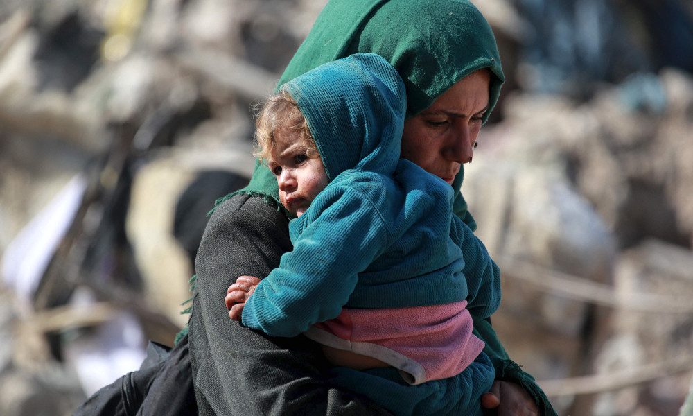 ১৮ মার্চ একজন ফিলিস্তিনি নারী শিশুকে কোলে নিয়ে গাজা উপত্যকার পূর্বাঞ্চল থেকে নিরাপদ আশ্রয়ের উদ্দেশ্যে যাচ্ছেন। ছবি : এএফপি