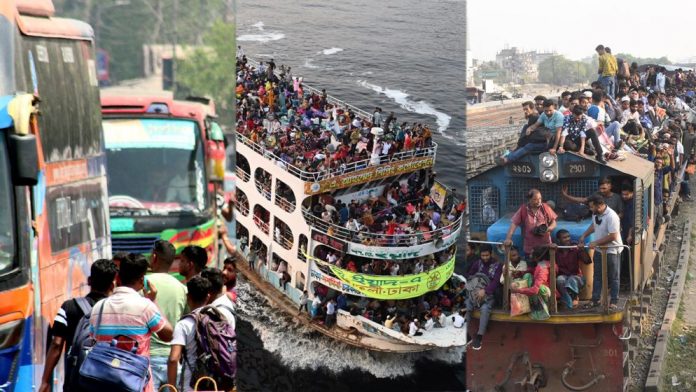 শনিবার রাজধানীর বিভিন্ন দূরপাল্লার বাসস্ট্যান্ড, কমলাপুর ও বিমানবন্দর রেলস্টেশন এবং সদরঘাট লঞ্চ টার্মিনালে সরেজমিন ঘুরে এবং সংশ্লিষ্টদের সঙ্গে কথা বলে পাওয়া গেছে এমন চিত্র।