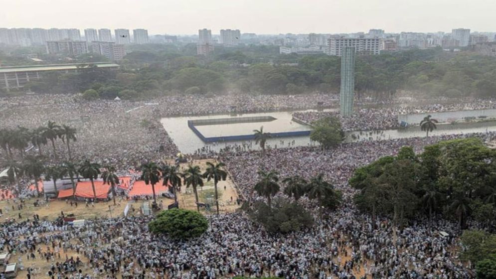 পাখির চোখে মার্চ ফর গাজা : ফিলিস্তিনিদের সঙ্গে সংহতি প্রকাশ করে দুপুর ১২টার পর থেকেই রাস্তায় নামে জনতার স্রোত। সবার গন্তব্য ছিল কর্মসূচির কেন্দ্রবিন্দু ঐতিহাসিক সোহরাওয়ার্দী উদ্যান। কিশোর, তরুণ, নারী বাদ যাননি কেউ। বাবার হাত ধরে গুটি গুটি পায়ে এগিয়ে আসে শিশুরাও। এভাবে খণ্ড খণ্ড মিছিল গিয়ে মিলিত হয় সোহরাওয়ার্দী উদ্যানের মূল কেন্দ্রে। ফলে দুপুরের আগেই কানায় কানায় ভরে ওঠে উদ্যানের খোলা প্রান্তর।