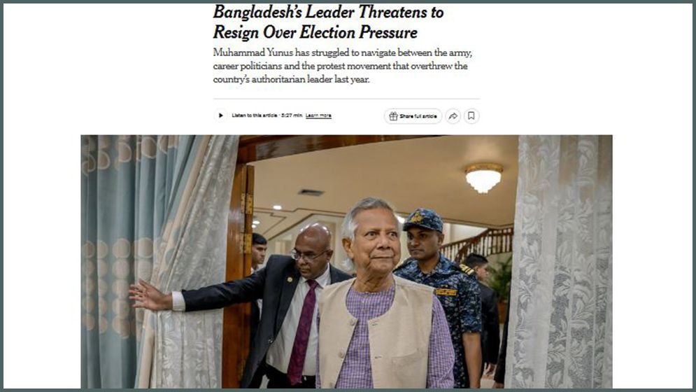 তার পদত্যাগের ঘোষণার পর এ নিয়ে প্রতিবেদন প্রকাশ করেছে নিউইয়র্ক টাইমস। সেখানে শিরোনাম করেছে ‘নির্বাচন নিয়ে চাপের মুখে অধ্যাপক ইউনূসের পদত্যাগের হুমকি’।