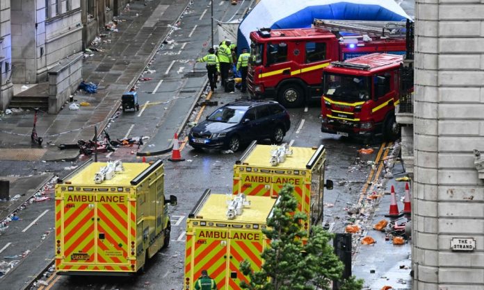লিভারপুল শহরে ভিড়ের মধ্যে গাড়ি উঠে যাওয়ার পর ঘটনাস্থলে উদ্ধারকর্মীরা। ছবি : এএফপি