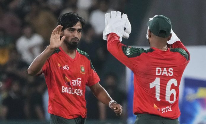 উইকেট নেওয়ার পর অধিনায়ক লিটনের সঙ্গে উদযাপন করছেন তানজিম সাকিব। ছবি : ক্রিকইনফো