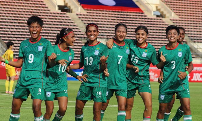 তৃষ্ণার (৯ নম্বর জার্সি) গোলের পর বাংলাদেশের মেয়েদের উচ্ছ্বাস। ছবি : বাফুফে