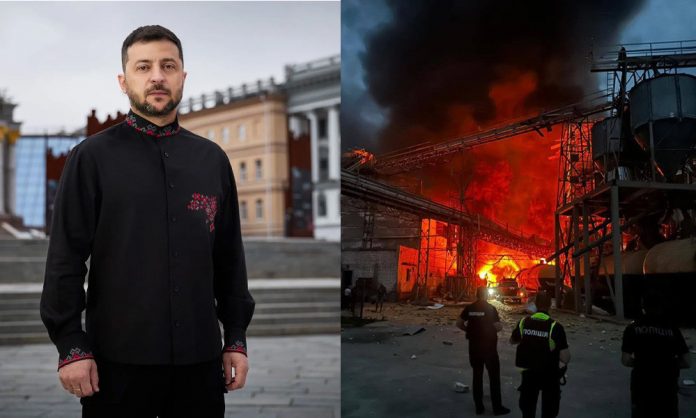 ইউক্রেনের স্বাধীনতা দিবসের ভাষণে জেলেনস্কি (বাঁয়ে) (ছবি : কিয়েভ ইনডিপেনডেন্ট), পারমাণবিক কেন্দ্রে আগুন (ফাইল ছবি : কিয়েভ পোস্ট)