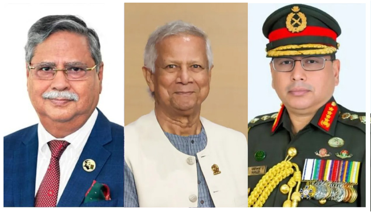 রাষ্ট্রপতি মো. সাহাবুদ্দিন, প্রধান উপদেষ্টা ড. মুহাম্মদ ইউনূস এবং সেনাপ্রধান জেনারেল ওয়াকার-উজ-জামান। ছবি : সংগৃহীত