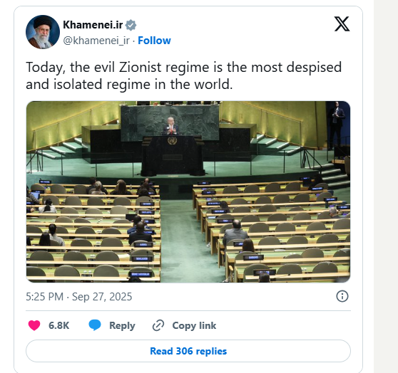 জাতিসংঘে ইসরাইলি প্রধানমন্ত্রী বেনিয়ামিন নেতানিয়াহুর ভাষণ বর্জনের ঘটনায় মুখ খুলেছেন ইরানের সর্বোচ্চ নেতা আয়াতুল্লাহ আলি খামেনি। তার মতে, এর মাধ্যমে প্রমাণ হয়েছে বিশ্বজুড়ে একঘরে হয়ে পড়েছে ইসরাইল।