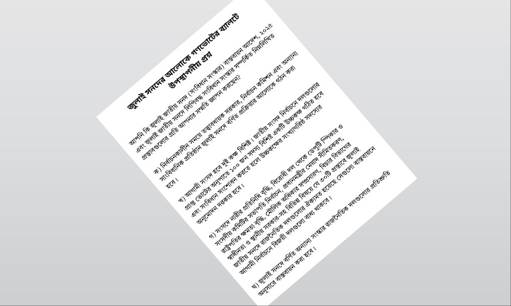 ‘জুলাই সনদের আলোকে গণভোটের ব্যালটে উপস্থাপনীয় প্রশ্নে’ উল্লেখ করে বলা হয়, আপনি কি জুলাই জাতীয় সনদ (সংবিধান সংস্কার) বাস্তবায়ন আদেশ, ২০২৫ এবং জুলাই জাতীয় সনদে লিপিবদ্ধ সংবিধান সংস্কার সম্পর্কিত নিম্নলিখিত প্রস্তাবগুলোর প্রতি আপনার সম্মতি জ্ঞাপন করছেন?