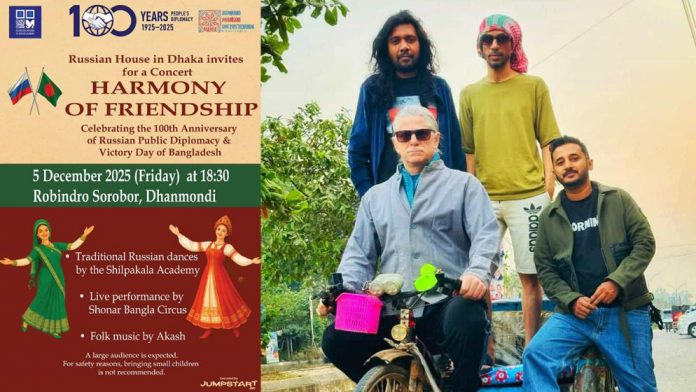 রাশিয়ান জনকূটনীতির ১০০তম বার্ষিকী এবং বাংলাদেশের বিজয় দিবস উদযাপন উপলক্ষ্যে আগামী ৫ ডিসেম্বর শীতের সন্ধ্যায় ঢাকার আকাশ ভরে উঠবে সুর আর উচ্ছ্বাসে! রাশিয়ান হাউস ঢাকা আয়োজিত ‘হারমোনি অব ফ্রেন্ডশিপ’ অনুষ্ঠানে থাকছে রাশিয়ার ঐতিহ্যবাহী লোকনৃত্য এবং বাংলাদেশের জনপ্রিয় ব্যান্ড ‘সোনার বাংলা সার্কাস’-এর কনসার্ট।