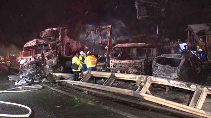 তুষারপাতের সতর্কতার মধ্যে নিউ ইয়ারের ছুটি শুরু হওয়ায় সড়কে যানবাহনের চাপ বেশি ছিল। দুর্ঘটনায় ক্ষতিগ্রস্ত ট্রাকগুলো রাস্তা আটকে দিলে পেছন থেকে আসা গাড়িগুলো পিচ্ছিল সড়কে ব্রেক করতে না পেরে একের পর এক ধাক্কা খায়।