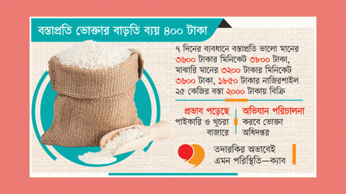 এদিকে রাজধানীর পাইকারি আড়তে চালের দাম বাড়ার প্রভাব খুচরা বাজারে এসে পড়েছে। রাজধানীর নয়াবাজার, মালিবাগ কাঁচাবাজার ও জিনজিরা বাজার ঘুরে খুচরা বিক্রেতাদের সঙ্গে কথা বলে জানা গেছে, শুক্রবার প্রতি কেজি ভালো মানের মিনিকেট বিক্রি হয় সর্বোচ্চ ৮৫ টাকা, যা এক সপ্তাহ আগে বিক্রি হয়েছে ৮০ টাকায়। রশিদ মিনিকেট প্রতি কেজি বিক্রি হচ্ছে ৭৬ টাকা। যা আগে ৭০-৭২ টাকা ছিল। ভালো মানের নাজিরশাল প্রতি কেজি বিক্রি হচ্ছে ৮৫-৯০ টাকা। যা আগে ৮০-৮৫ টাকা ছিল।
