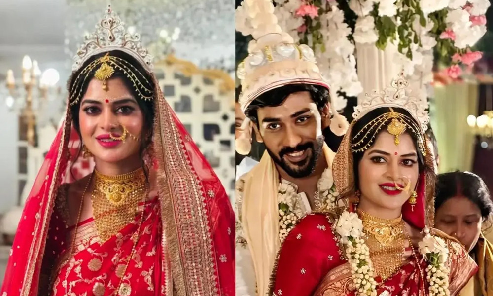 বিয়েতে একেবারে ঐতিহ্যবাহী বাঙালি সাজে ধরা দেন মধুমিতা। লাল বেনারসি শাড়ি, সোনার গয়নায় মোড়া সাজ, কপালে সূক্ষ্ম চন্দনের আলপনা—সব মিলিয়ে কনের সাজে ছিলেন অপরূপা।সামাজিক মাধ্যমে ছড়িয়ে পড়া ছবিতেই তা স্পষ্ট।