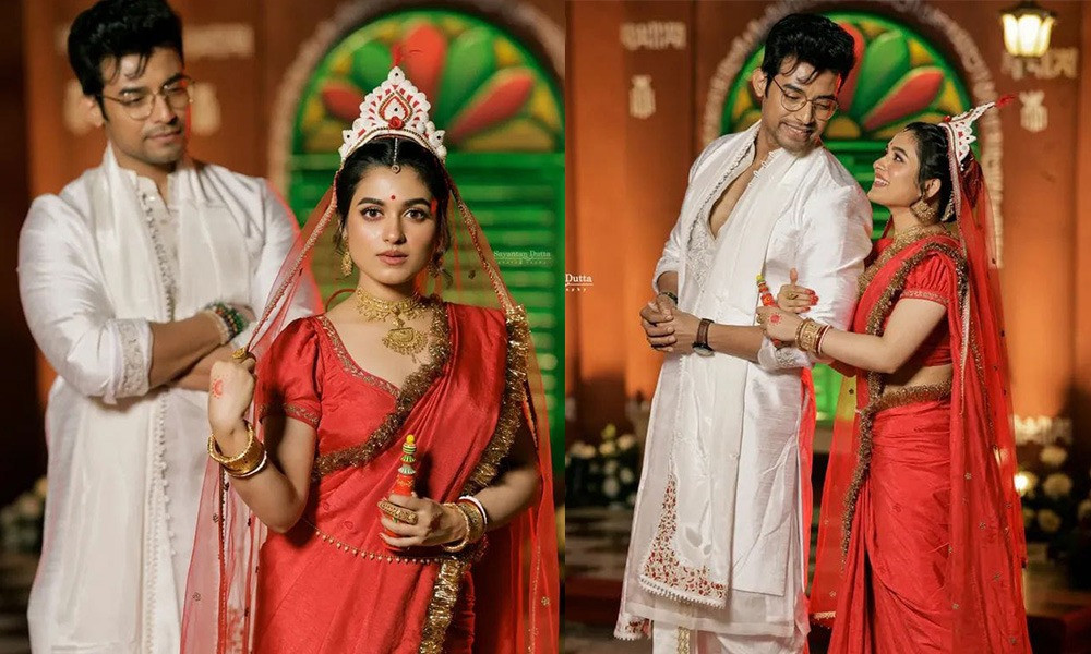 কাঁধে চাদর নিয়ে তাকে দেখাচ্ছিল অনেকটা ‘জমিদার’ বাবুর মতো। শ্যামৌপ্তি প্রথাগত বেনারসি না পরলেও লাল শাড়ি, চন্দন আর শোলার মুকুটে সেজেছিলেন। গলায় ছিল রজনীগন্ধার মালা আর পরনে ভারী সোনার গয়না।