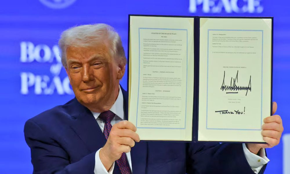 শান্তি পর্ষদের বৈঠকের প্রস্তাবনা নথিতে স্বাক্ষর করেছেন ডোনাল্ড ট্রাম্প। ছবি : রয়টার্স