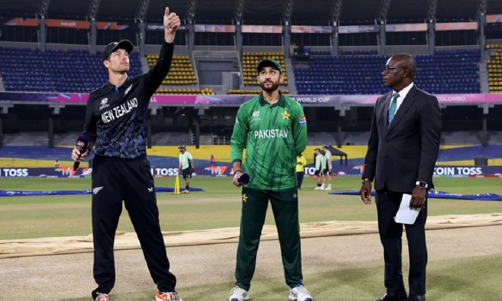 পাকিস্তান-নিউজিল্যান্ড ম্যাচে টসের মুহূর্ত। আজ কলম্বোয়। ছবি: আইসিসি