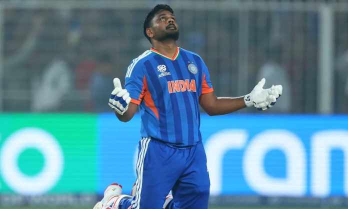 ভারতকে সেমিফাইনালে তোলার পর সৃষ্টিকর্তাকে স্মরণ সঞ্জু স্যামসনের। আজ কলকাতার ইডেন গার্ডেন্সে। ছবি: সংগৃহীত