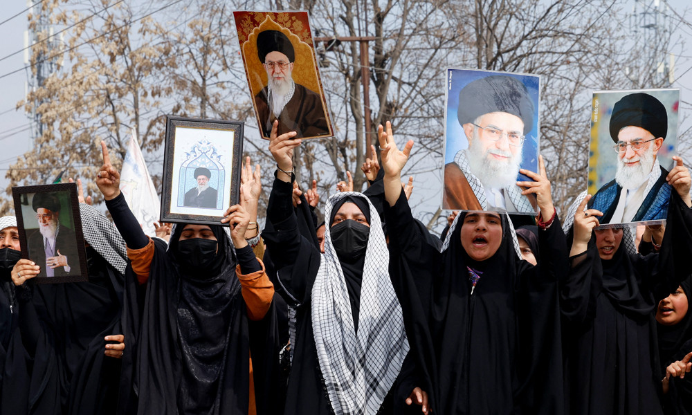 ইমাম খোমেনি গ্র্যান্ড মসজিদে এলাকায় প্রয়াত সর্বোচ্চ নেতা আয়াতুল্লাহ আলী খামেনির ছবি হাতে মুসল্লিরা। ছবি- রয়টার্স
